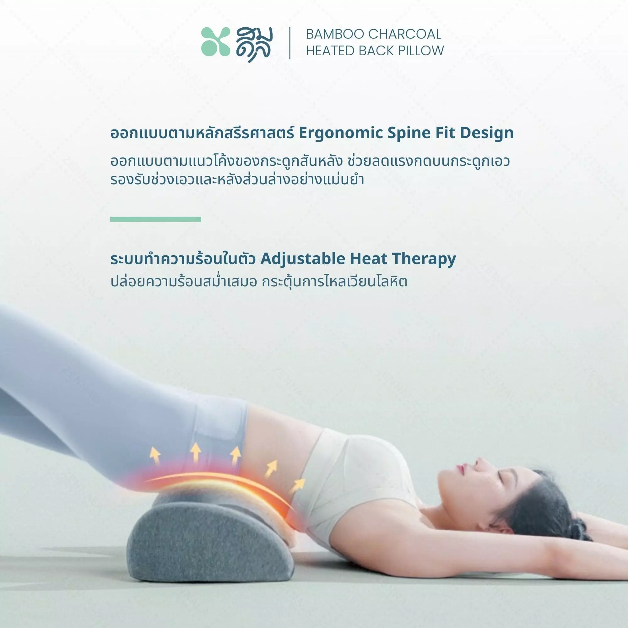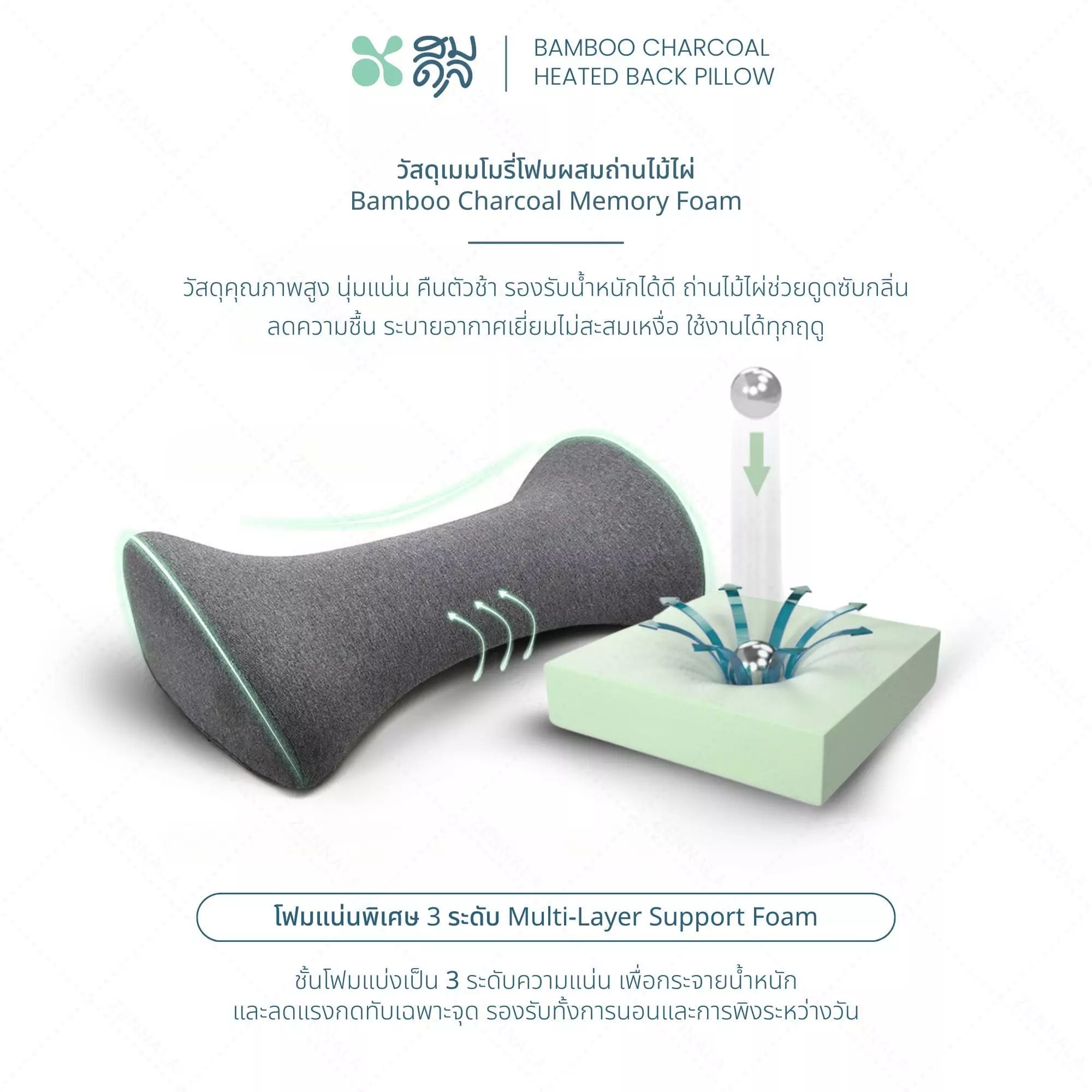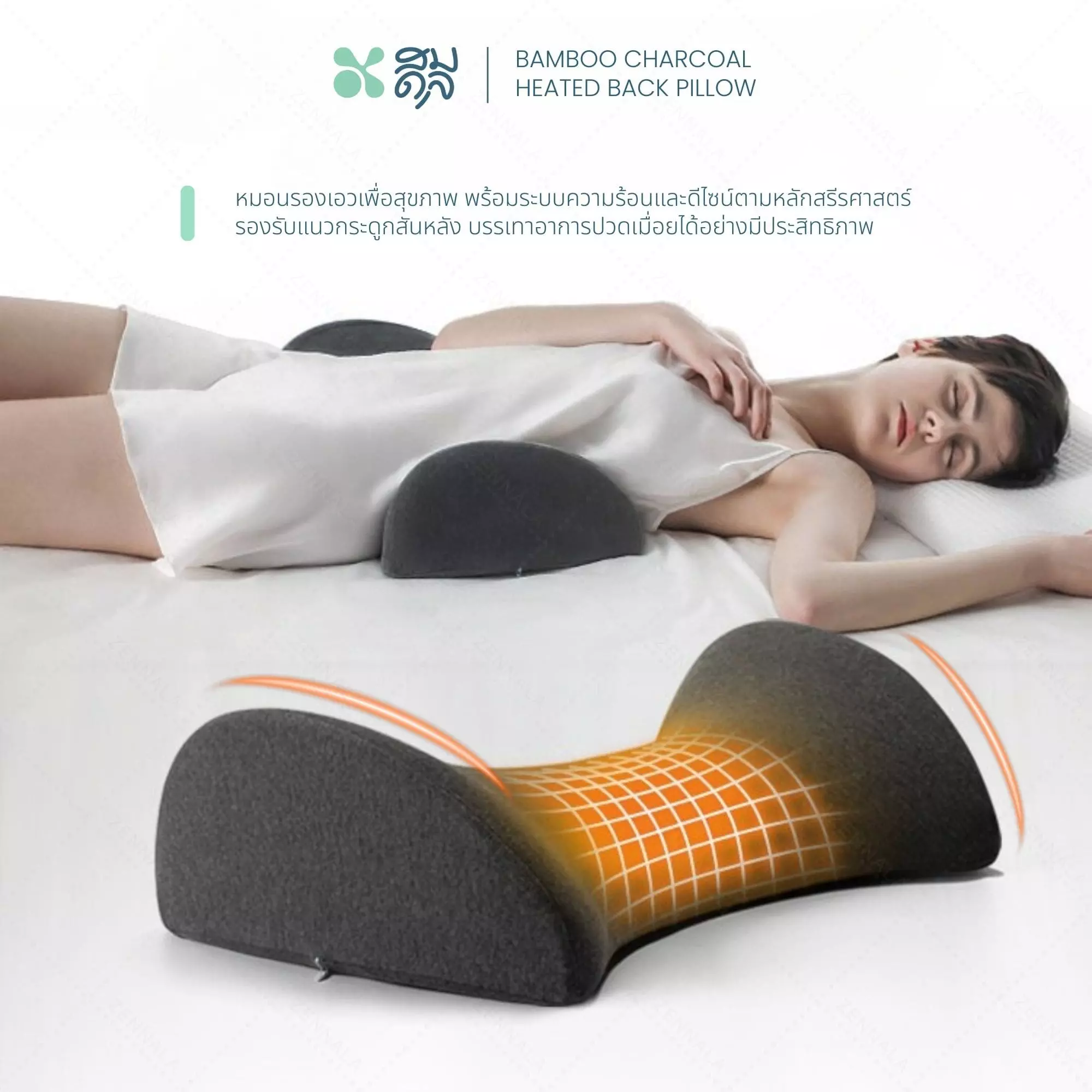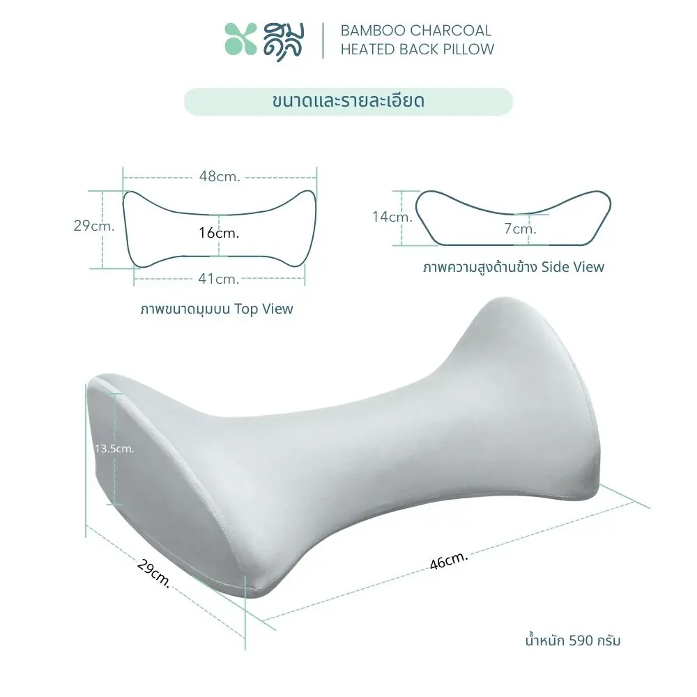- หมอนรองเอวเมมโมรี่โฟมผสมถ่านไม้ไผ่ ช่วยรองรับแนวกระดูกสันหลัง ผ่อนคลายกล้ามเนื้อได้ดี