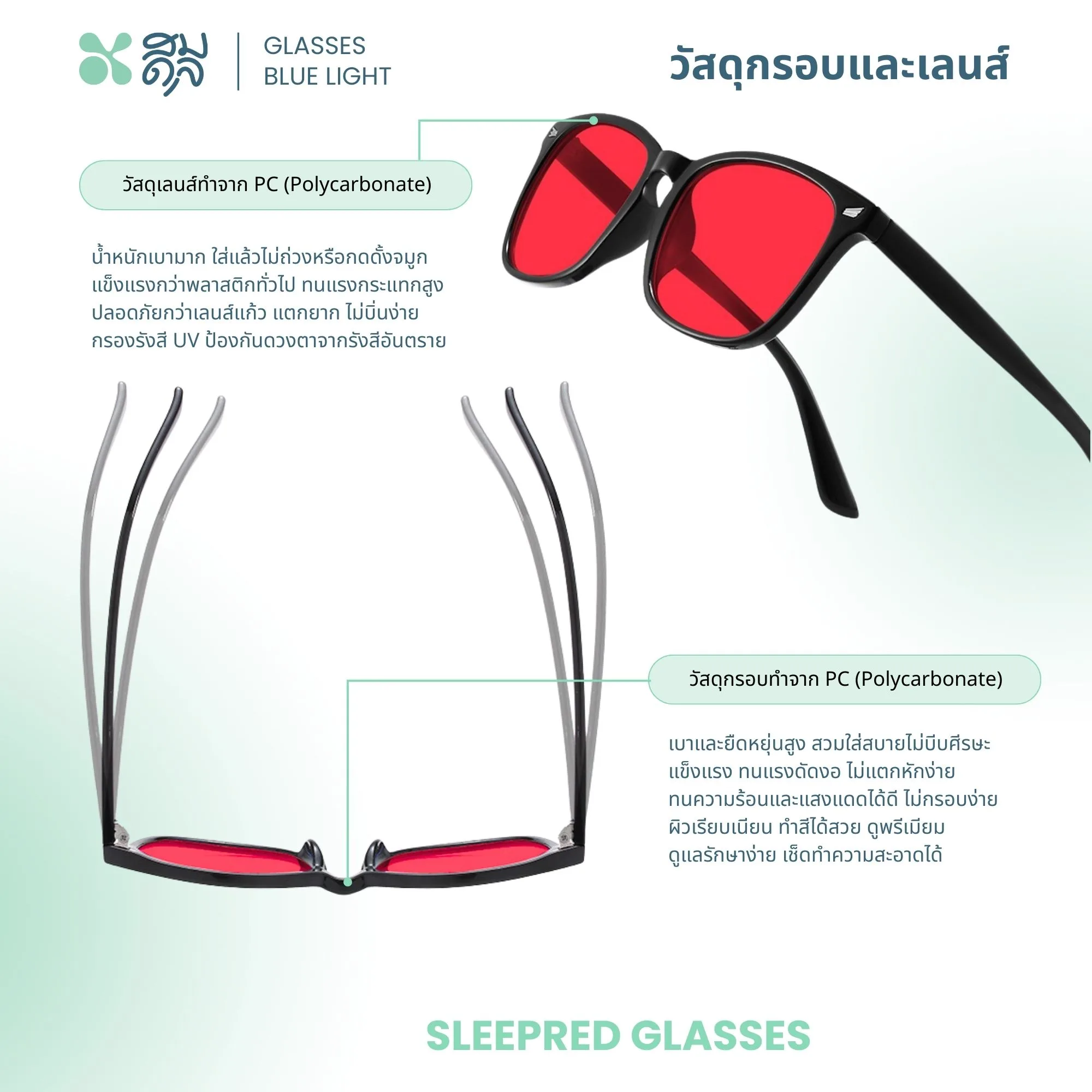• วัสดุเลนส์ : PC (Polycarbonate)