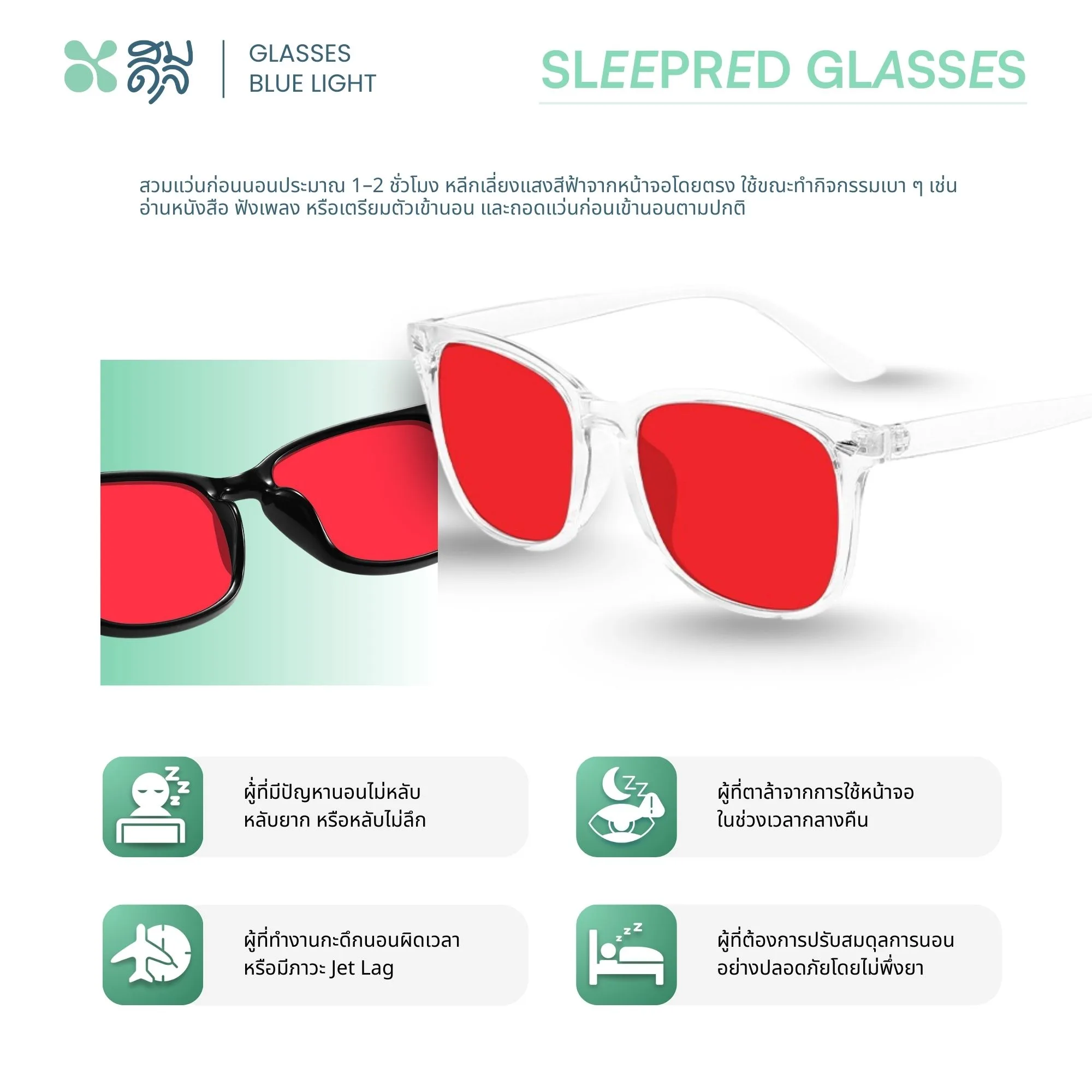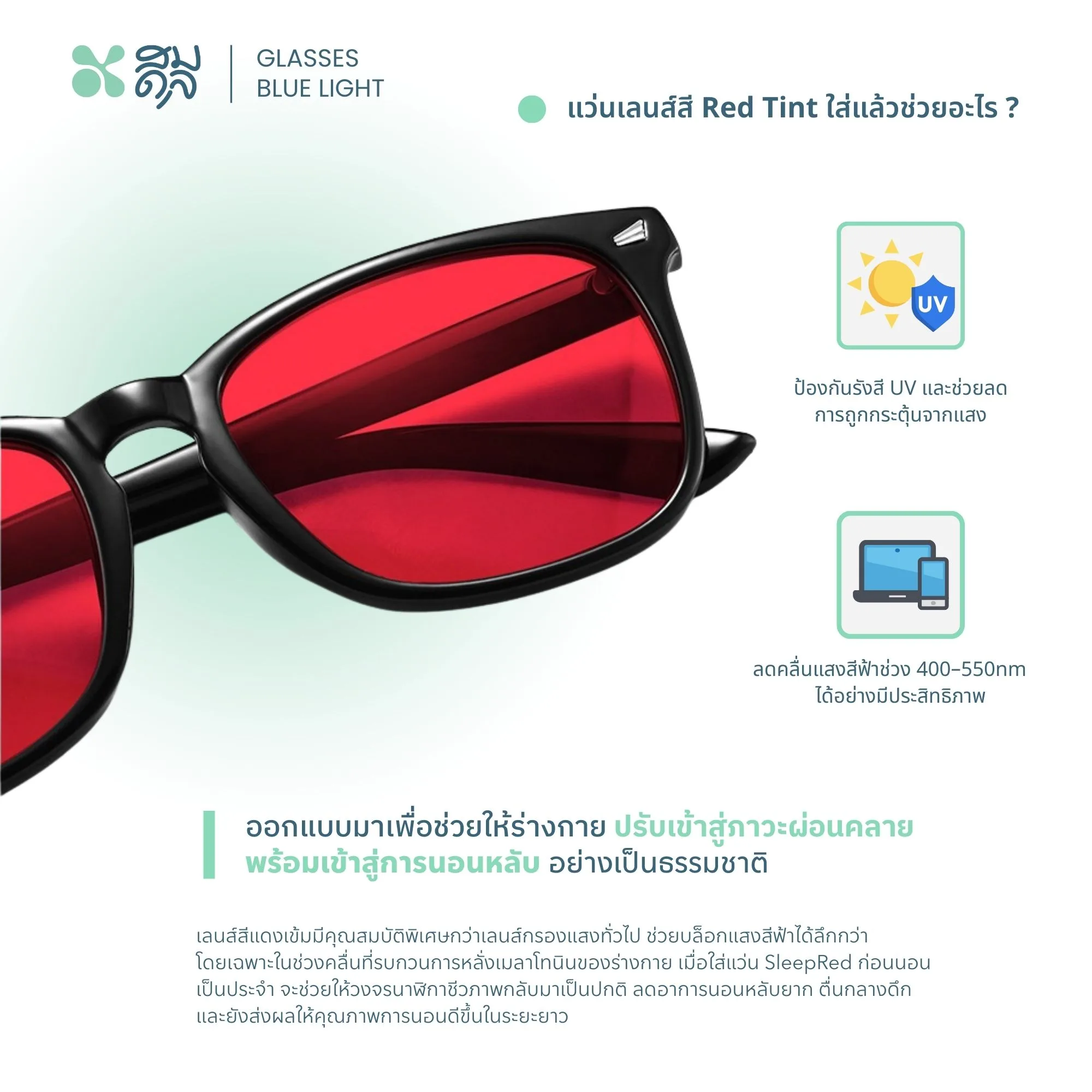 • แว่นกรองแสงสีฟ้า Red Tint Lens ออกแบบมาเพื่อช่วยให้ร่างกายปรับเข้าสู่ภาวะผ่อนคลาย พร้อมเข้าสู่การนอนหลับอย่างเป็นธรรมชาติ