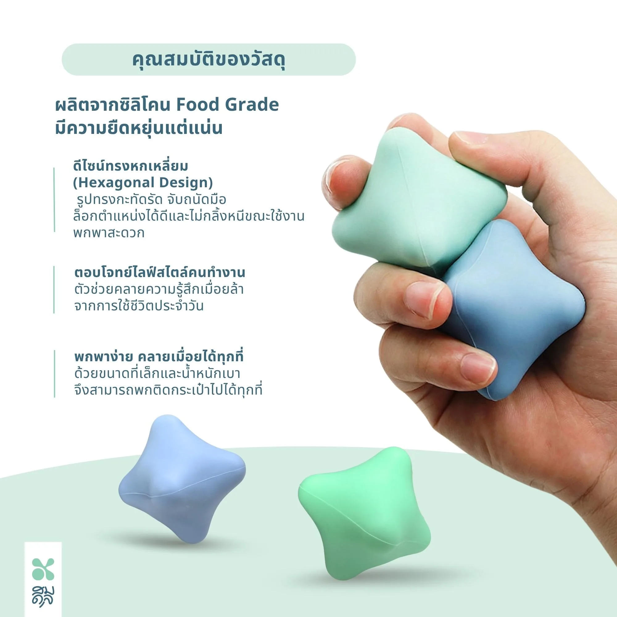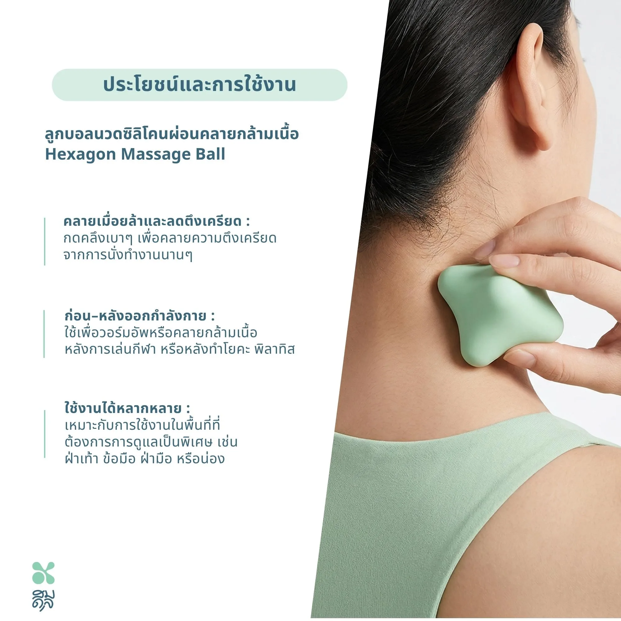 - ตัวช่วยก่อนและหลังทำกิจกรรม: ใช้กดนวดเบา ๆ เพื่อเตรียมความพร้อมร่างกายก่อนออกกำลังกาย (Warm-up) หรือใช้ผ่อนคลายหลังทำกิจกรรม (Cool Down)